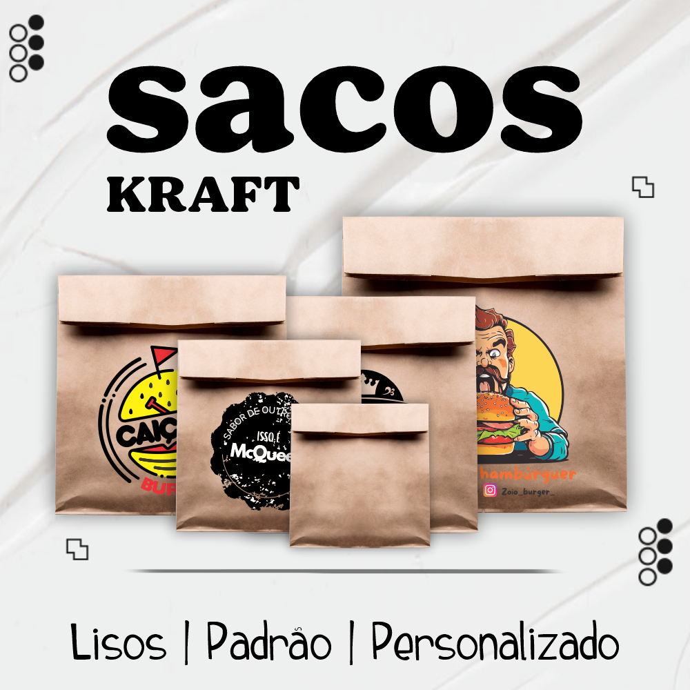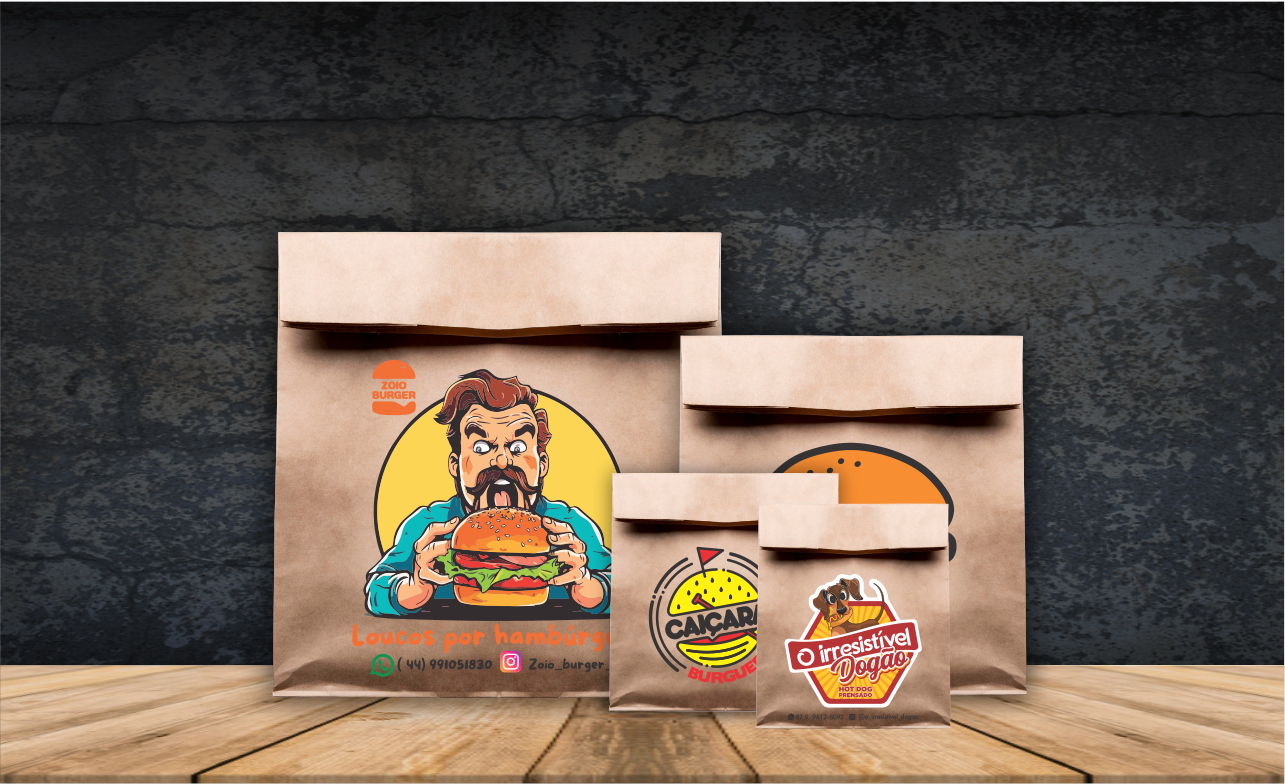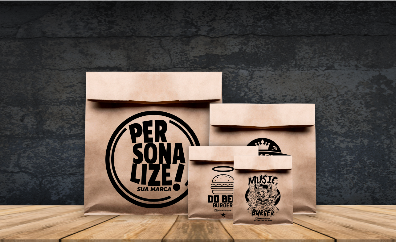 4 tamanhos diferentes. Impressão só frente e frente e verso. Papel Kraft 80g premium super resistente. Estampas apenas na cores: